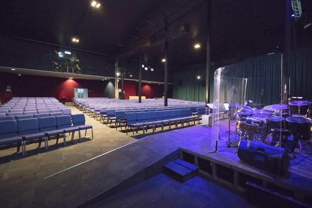 The large auditorium comfortably seats 300 people. It has a large stage complete with ambient lighting options, spot lighting and a full audio desk.